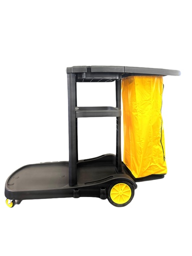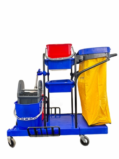 عربية تنظيف بلاستيك ازرق-اسود مع 3 رفوف كيس اصفر م